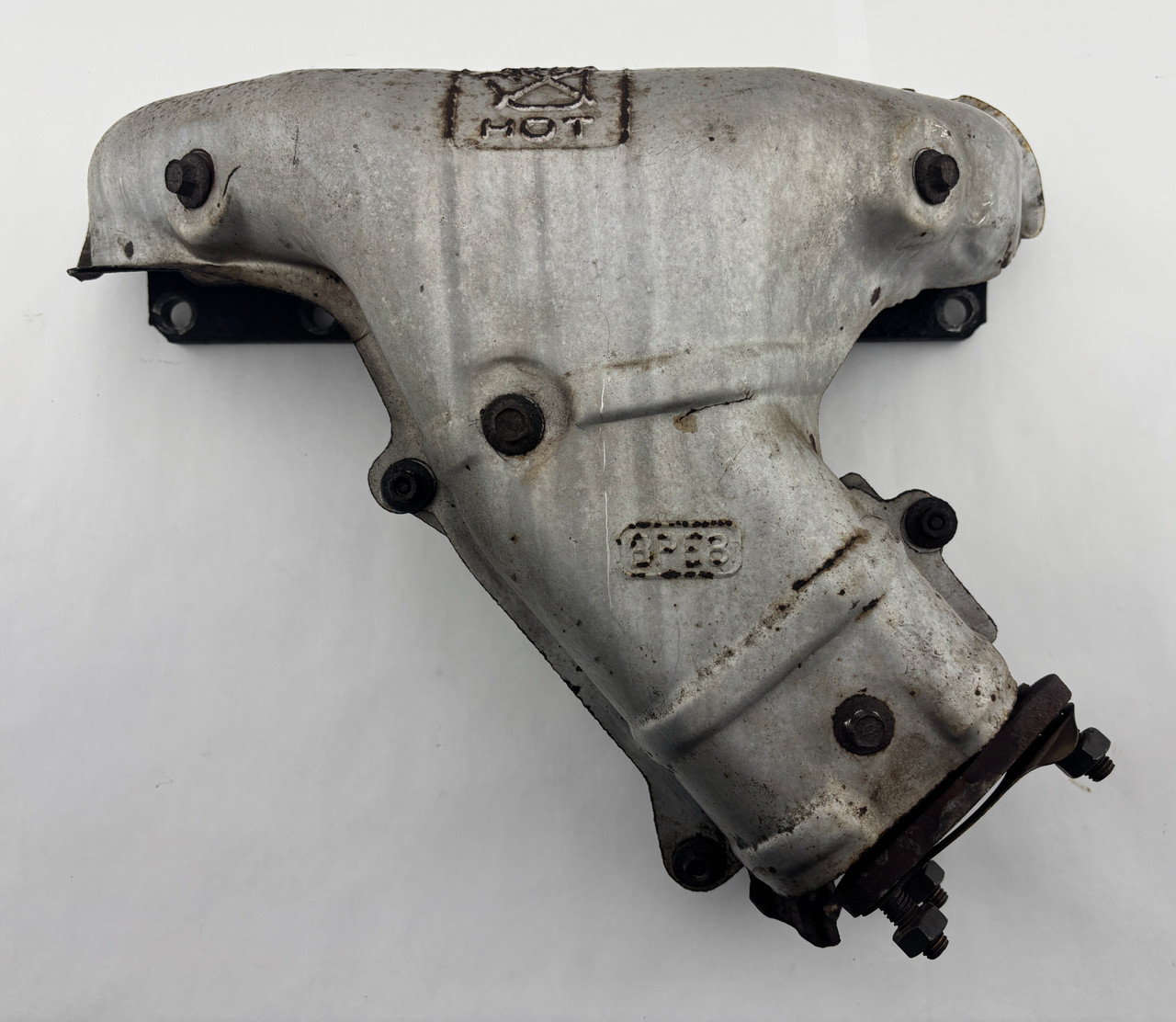 In mostly good used physical condition with no cracks or damage in the piping. All three down pipe studs are intact with no major damage, however the nuts were replaced as shown. One tab for the heat shield has broken off as highlighted in the photos. There is some corrosion and surface rusting due to age. You will need to reuse your existing hardware and EGR tube for installation.